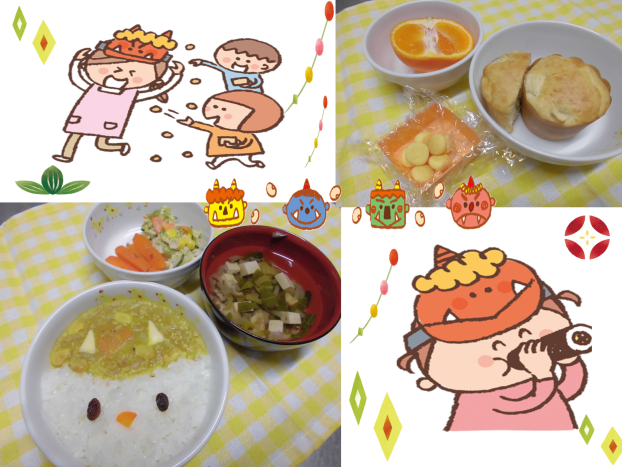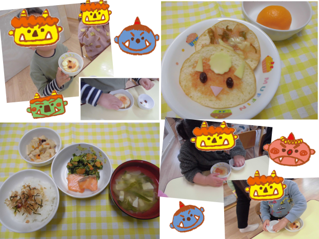 今日は節分メニューです!クラスにはかわいい鬼さんがいっぱいいたようですが、給食にも鬼が登場です♪「わーい」と喜んでくれて、「お家でママのカレー食べたの」と教えてくれるお友達もいました!節分の日には、豆をまいて悪い鬼を追い払います。今日は鬼のカレーに大豆がはいっていました☆