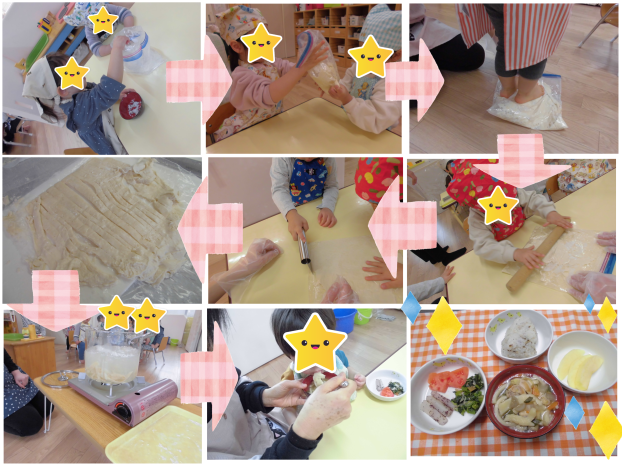 ごはんを食べる前に、茹でるところも見てもらいました。極太うどんや細長いうどん、変な形のうどん、弾力があって美味しいうどんが完成しました!「見て、変な形のでてきた!」とみんな嬉しそうに食べてくれました☆彡