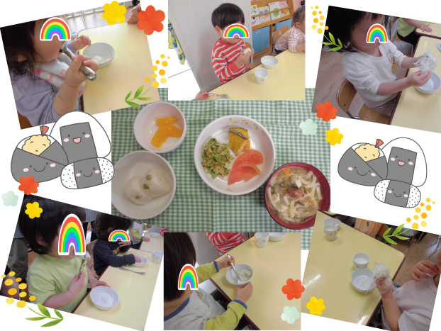 にじ組さんは、自分でにぎってお皿にころんと出して食べたり、ラップを上手にめくりながら食べている姿が見られました!