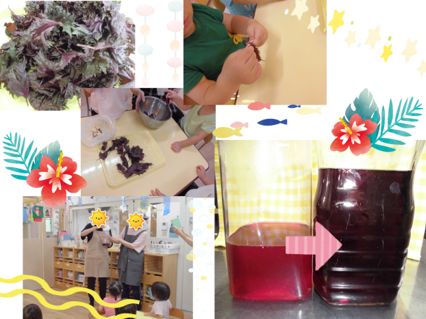 今日の午前中に、にじ組くまグループのおともだちにしそジュースに使うしそのじく取りをお願いしました!