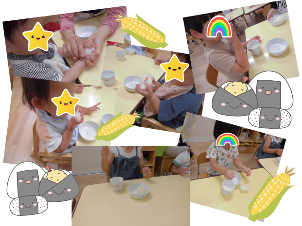 今日のおやつは、昨日にじ組さんにむいてもらった旬のとうもろこしを使った、とうもろこしおにぎりでした♪