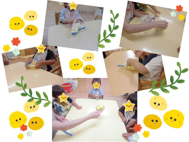 茹でて味付けをしたじゃがいもを、みんなでにぎにぎ、ぎゅっぎゅっとつぶしてマッシュポテトにしました♪