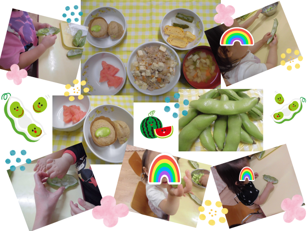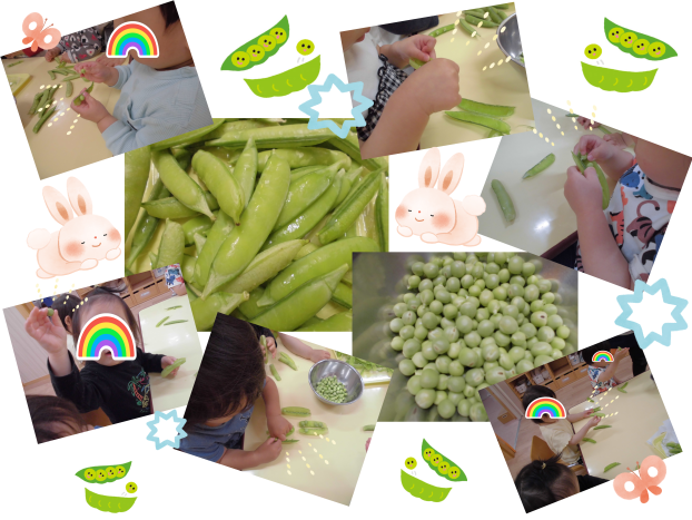 今日は、午前中ににじぐみうさぎグループのおともだちに「うすいえんどう」むきのお手伝いをしてもらいました!