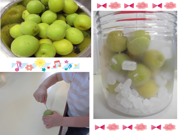 今日は梅と氷砂糖を瓶につめて、梅ジュースのシロップ作りをしました!