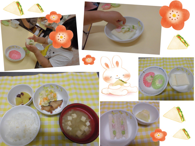 今日はくまグループさんにおやつのサンドイッチを作るクッキングをしてもらいました!お皿の上にのったパンに、具材のポテトサラダとくまさんの形をしたチーズをはさんみます。パンの上に具材をのせたら、上手にはさんでできた~!とみせてくれました♪チーズだけはさむ子、パンだけで食べている子などみんなそれぞれの食べ方で楽しんでくれました☆彡