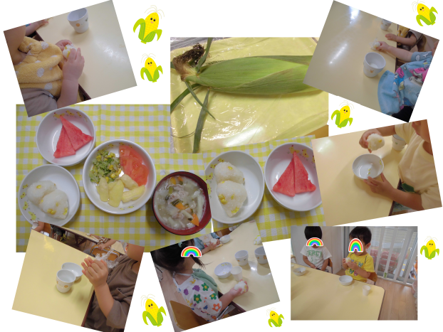 おやつには今が旬のとうもろこしを使ったマフィンです。上手にとうもろこしを見つけだす子も!果物はすいかです。今年はこれで最後かな~?8月も終盤ですがまだまだ暑い日が続きます。水分補給をしっかりとりながら涼しい秋を楽しみに待ちたいと思います♪