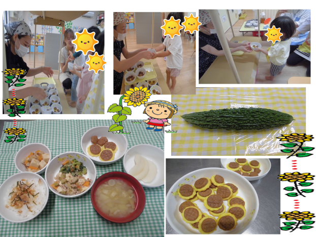 今日の給食にはゴーヤがでてきました!ゴーヤは苦味があって好き嫌いが別れる食材ですね。ゴーヤは熱に強いビタミンCを豊富に含むことから夏バテ予防になります☀調理前のゴーヤも見てもらって、匂いをかいだりしてくれました♪大きくて立派なゴーヤでした!
