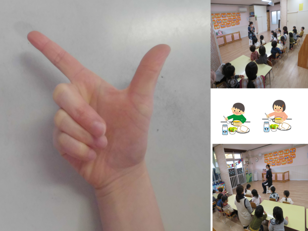 くまグループのお友だちは、」手を「イエーイ」の形にしてスプーンを握ります。