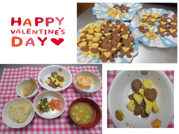 今日はバレンタインデーです。バレンタインデーでは、大切な人へ贈り物をするという風習があります。給食室からの想いを込めて、今日はハートがいっぱいの給食でした♡
