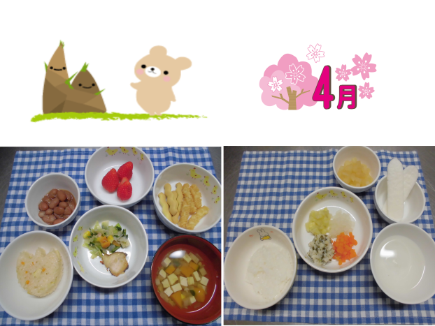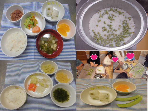 給食では、うすいえんどうを使った豆ごはんを、おやつでは大きなイチゴを添えて提供したので、春の香りいっぱいのメニューになりました!