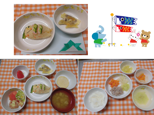 また春野菜の菜の花を使い、ゆかり和えを作ったので、花形にしたちらし寿司、ゆかり和えの菜の花とお花いっぱいの給食になりました♬