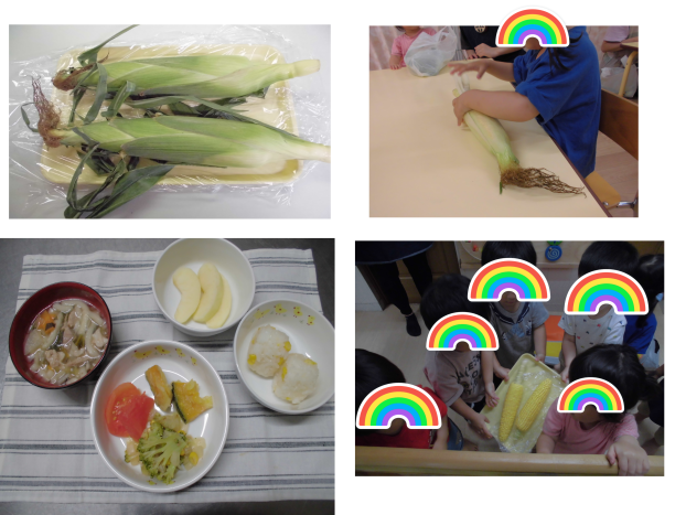 今日はくまグループさんがとうもろこし皮むきのお手伝いをしてくれました!大きくて立派なとうもろこしの皮を、お友達と一緒に引っ張ったり上手におひげまでとってくれて、給食室まで持ってきてくれました♪