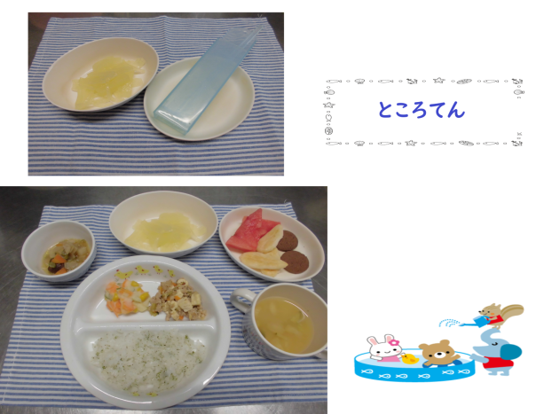 おやつは先日、にじ組さんにお手伝いしてもらって作ったしそジュースで七夕ゼリーを作りました。とてもきれいな色に出来上がりました♬