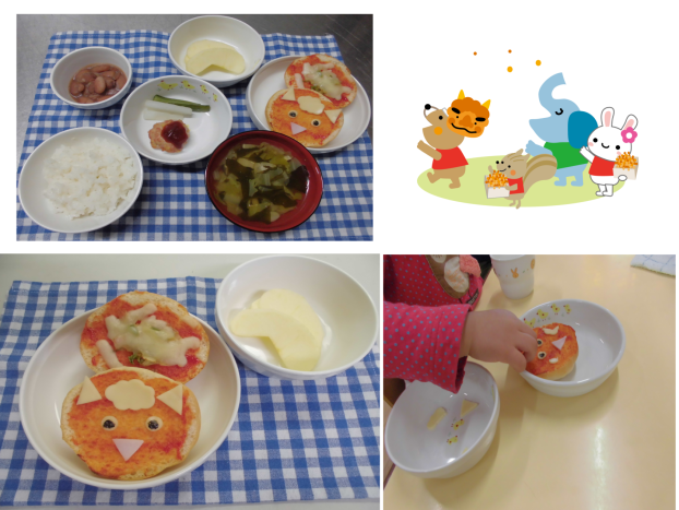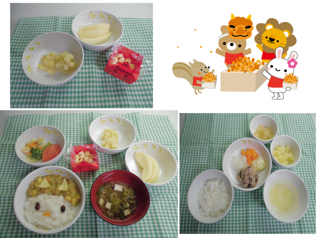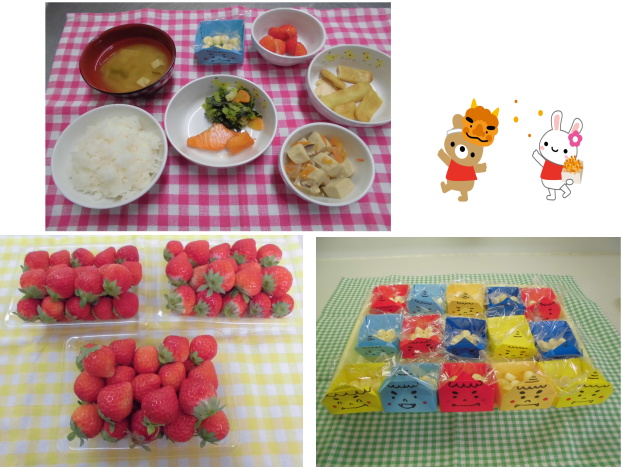 今日は節分です。節分は、季節の変わり目に起こりがちな病気や災害を鬼にみたてて、悪いもの(鬼)を追い払い、良いもの(福)を呼び込むために、豆まきをします。豆まきの豆には炒った大豆を使います。豆を歳の数だけ食べると、体が丈夫になって病気になりにくいとされています。今日の給食のカレーライスにもはいっていましたよ♪カレーライスは鬼の顔になっていましたが、みんな大きくお口をあけて食べてくれました!