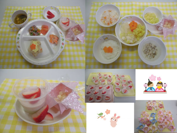 お菓子はひなあられの代わりに全クラス食べれるトウモロコシのお菓子を千代紙で作った容器に入れて提供しました。