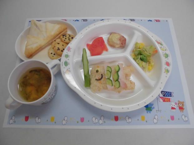 子どもたちに「今日のごはんは何の形をしていた?」と聞いたら、「こいのぼり!」と元気に答えてくれ、みんな楽しんで食べてくれたようで嬉しかったです。