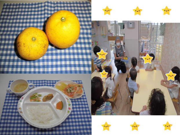 くま組さんは昨日、うさぎ組さんは今日、それぞれ「河内晩柑」見てもらいました♪