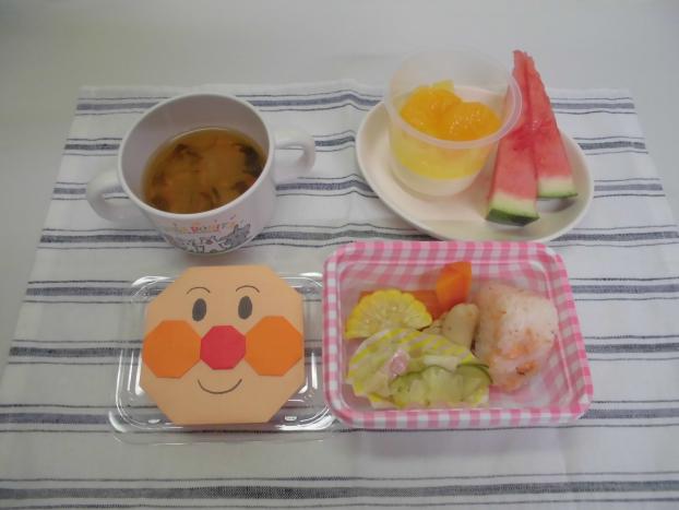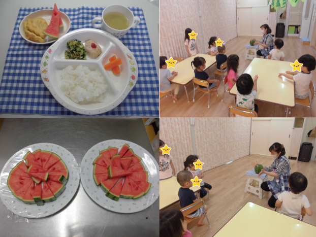 おやつの時間にくま組さんに覗きに行くと、「すいか、食べたよ~」「すいか、もっと食べたい~!」と教えてくれました。