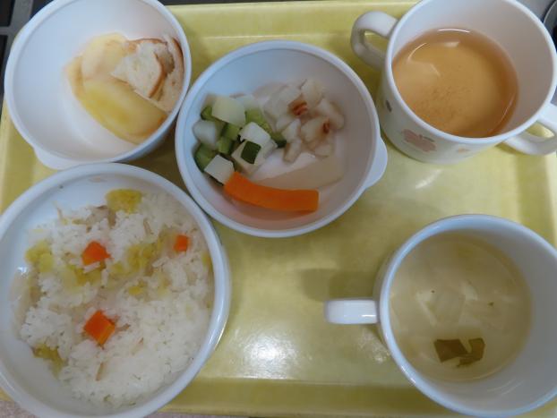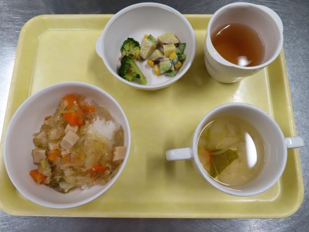 野菜軟飯・白身魚のあんかけ・ポテトサラダ・おすまし です。