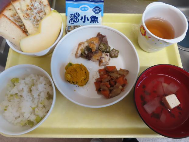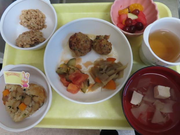 ごはん・チキン豆腐ハンバーグ・金時豆・おくらのおかか和え・卵スープです。
