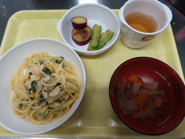 コーンクリームパスタ・さつまいものおかか煮・きゅうりの胡麻スティック・おすまし