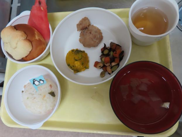 さつまいもかゆ・ささみのあんかけ・白和え・白菜とツナの煮物・おすまし です。