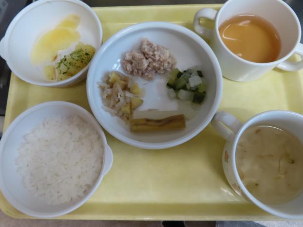 白かゆ・白身魚のあんかけ・ポテトサラダ・大根とさつまいもの煮物・お味噌汁(上澄み)