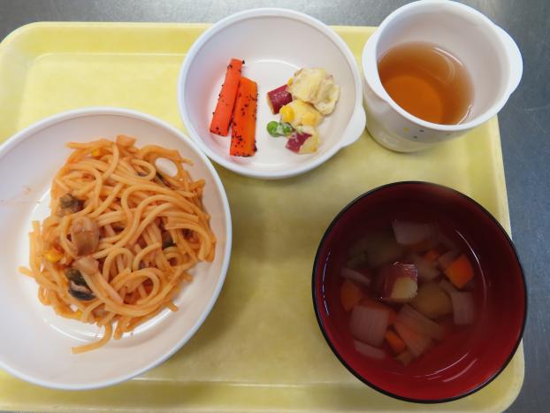 スパゲティナポリタン・人参ゆかりスティック・さつまいもサラダ・おすまし です。