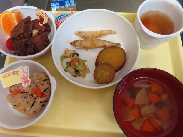 ひじきの炊き込みごはん・わかさぎの磯フライ(0歳白身魚)・さつまいもの甘煮