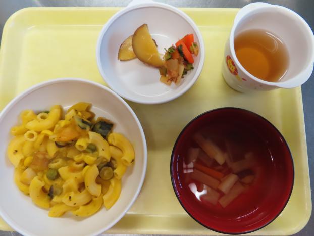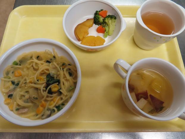 クリームマカロニ・さつまいもの甘煮・大根と人参のおかか和え・おすまし です。