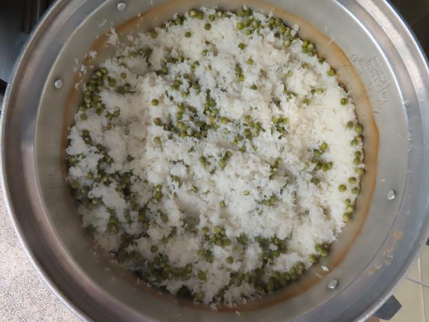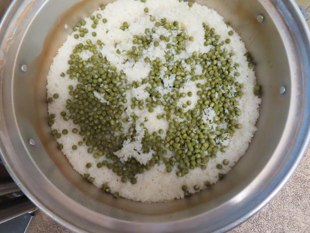 昨日、すいか組さんがむいたえんどう豆で、豆ごはん作りました。