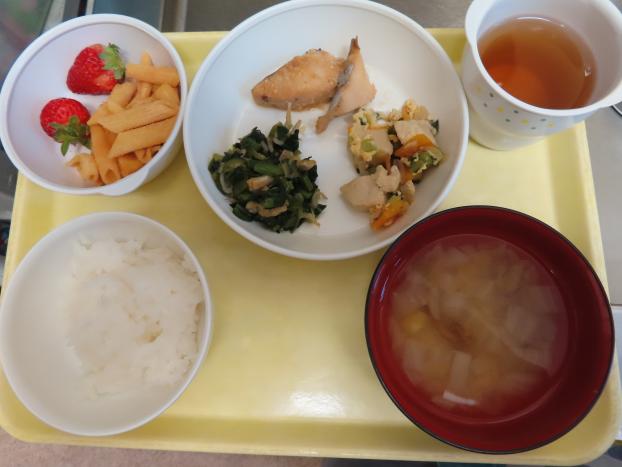 鮭ちらし寿司・大豆入りハンバーグ・春菊とほうれん草の胡麻和え・いちご・卵スープ