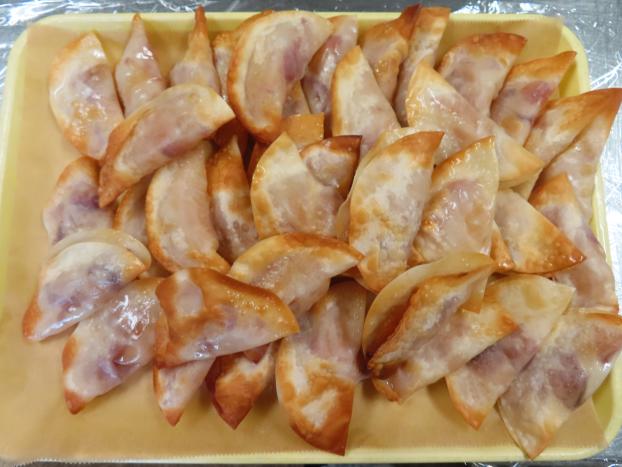 餃子の皮にたっぷりりんごとさつまいもを入れてこんがり焼きました!!