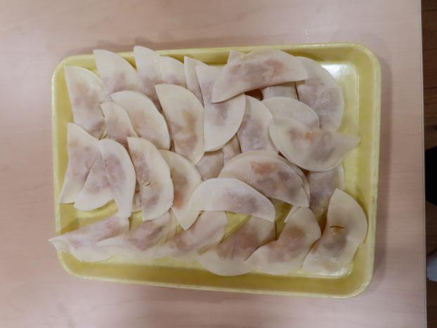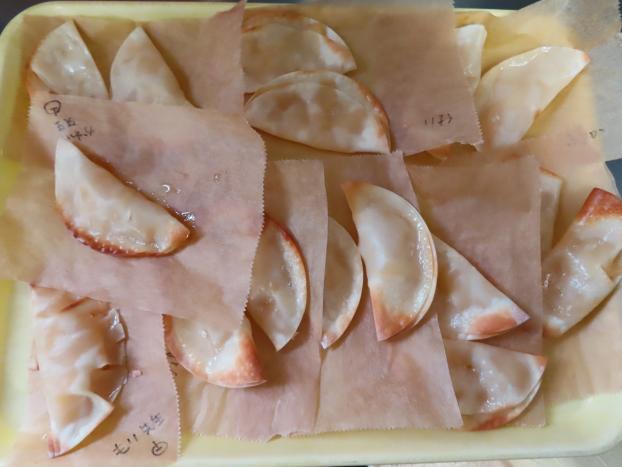 今日は、餃子の皮にりんごの甘煮をスプーンでのせてつくりました!!