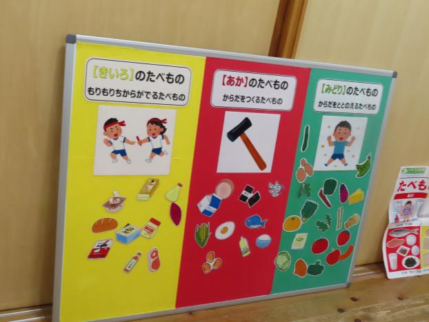 ”赤・黄・緑には、こんな食材があるんだよ”とお話した後、1人ずつ食材をどのグループ