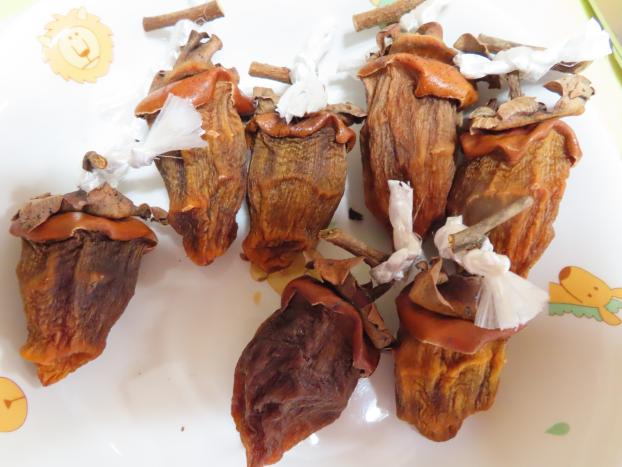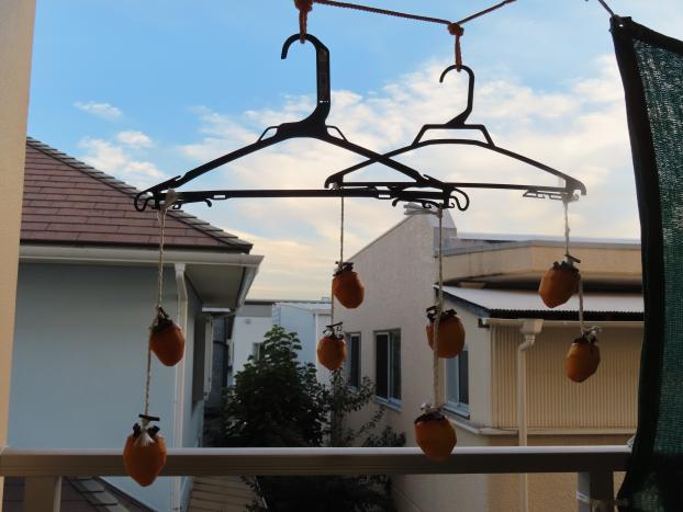渋柿の皮をむいて、温かいお湯につけて、ひもにつるして10日~2週間で出来上がります。