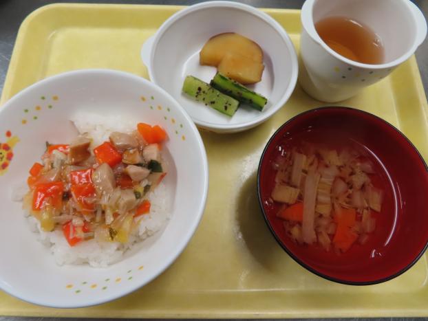 中華丼・さつまいもの甘煮・きゅうりのゆかりスティック・おすまし です。