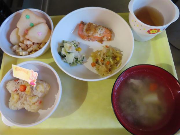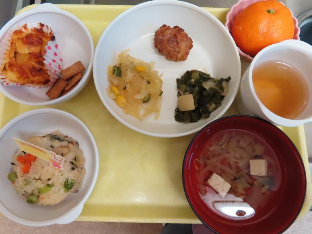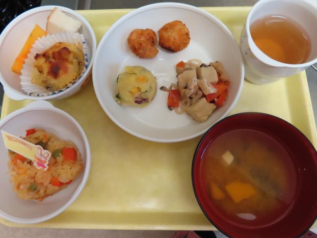 人参ごはん・鶏ミンチボールからあげ・高野豆腐の含め煮・さつまいもサラダ・