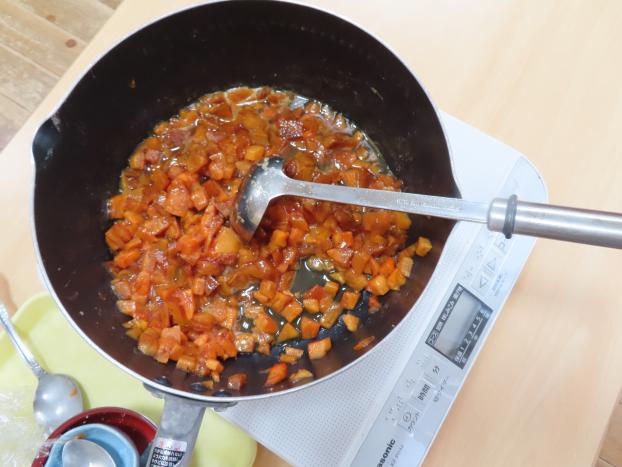 みんなグツグツ煮えるのを見ながら、おたまで混ぜるお手伝いをしました。