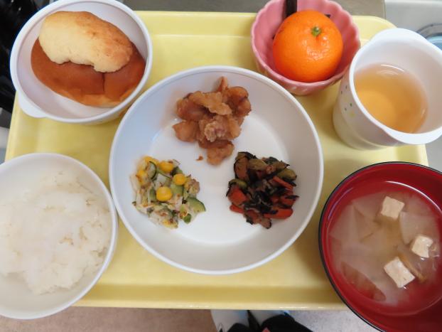 ごはん・鶏肉のから揚げ・ひじきの五目炒め・白菜の胡麻マヨ和え・お味噌汁です。
