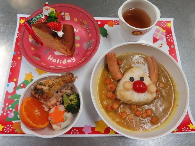 トナカイカレー・鶏肉の磯焼き・ポテトサラダ・おかかブロッコリー・みかん です。