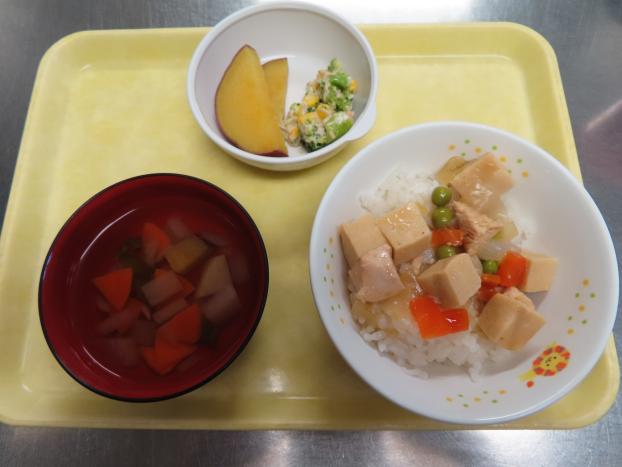 高野豆腐の鶏肉丼・ブロッコリーとコーンのサラダ・さつまいもの甘煮・おすまし