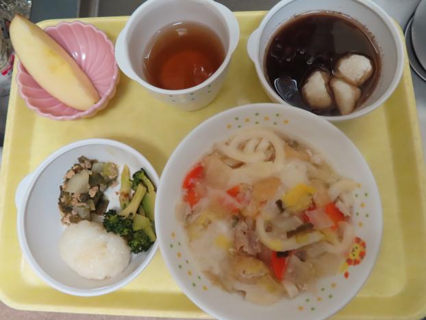 豚汁うどん(幼児はもち入り)・かぶのそぼろ煮・もち米おにぎり・おかかブロッコリー